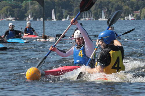 Alle Spieler*innen sitzen im Kajak, siehe Video von unserem kleinen Turnier am Wannsee. Kanupolo ist für alle die Lust auf Teamsport haben und keine Angst vor Wasser sowie Bällen haben. Anmerkung: