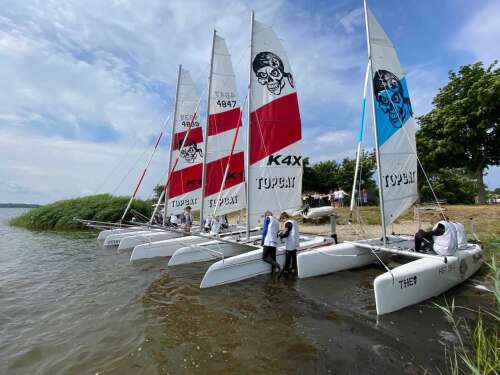 Mit einer Flotte von Topcats K1 wird die Insel Hiddensee in 2 Tagen auf 2 Kufen umrundet. In Begleitung eines erfahrenen Segellehrers mit einem Sicherungsboot, werden die Segelcrews über die Bodden- und Ostseegewässer begleitet.