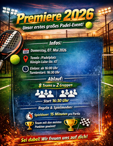 Wir freuen uns auf viele motivierte Teams, faire Duells und eine entspannte Turnier‑Atmosphäre – bei der Premiere unseres ersten großen Padel‑Events.