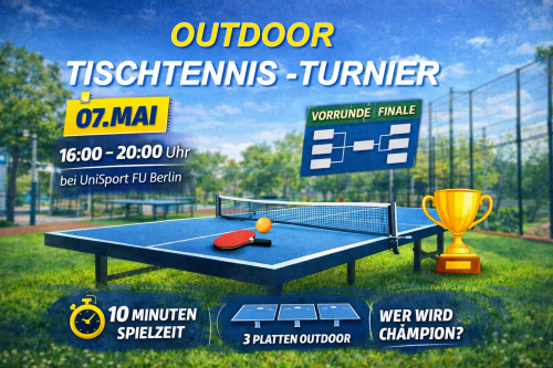 im Rahmen der Eröffnung des Padel-Platzes auf dem UniSport-Gelände der Freien Universität Berlin laden wir euch herzlich zu einem besonderen Outdoor-Tischtennisturnier ein! Lasst euch von einem ungewöhnlichen Setting unter freiem Himmel überraschen – bei frischer Luft, Sonne und viel Spaß um den kleinen, weißen Ball.