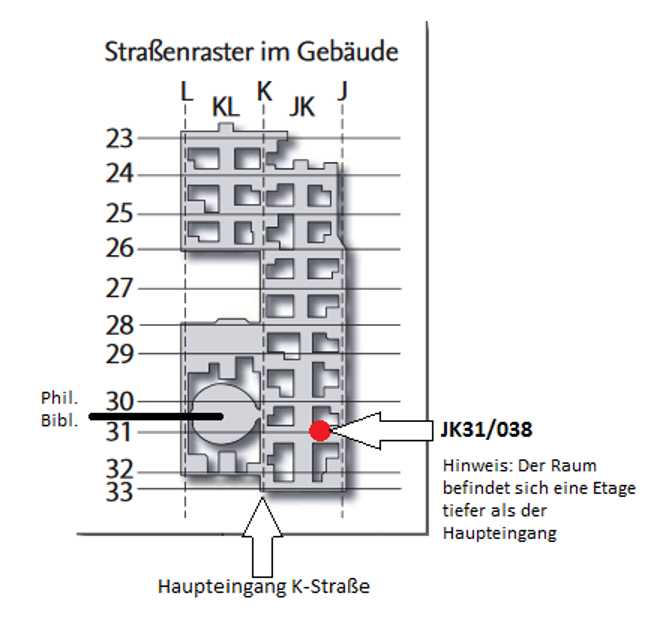 Gegenüber vom Eingang der Philologischen Bibliothek die Querstraße 31 nutzen und eine Etage tiefer gehen. Der Raum befindet sich gegenüber vom Eingang der Zentralwarte hinter der Tür links.